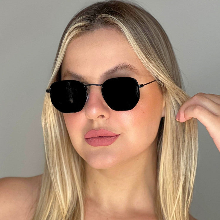 Óculos com formato hexagonal, acabamento minimalista e lentes com proteção UV400. Leve, confortável e perfeito para um visual elegante e atemporal.